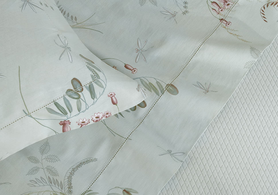 Na medida Queen, o jogo de cama Bronte traz a delicadeza da flor de oliveira em uma estampa exclusiva, desenhada à mão como quem eterniza uma paisagem com leveza e emoção. Confeccionado em cetim 200 fios de algodão, possui sobre lençol de 2,40 m x 2,60 m, lençol com elástico de 1,60 m x 2,00 m x 45 cm e duas fronhas de 50 cm x 70 cm com três abas e ponto ajour. Seu toque é suave como a sombra fresca sob o sol siciliano, proporcionando conforto e charme ao ambiente. A harmonia entre estampa, matéria-prima e acabamento eleva o cotidiano, transformando o momento de descanso em um instante de respiro e beleza natural.